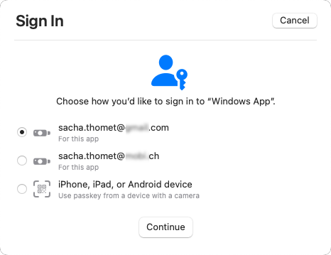 Und bei mehreren Identitäten auf dem Security Key erscheint auch die Identitätsauswahl.